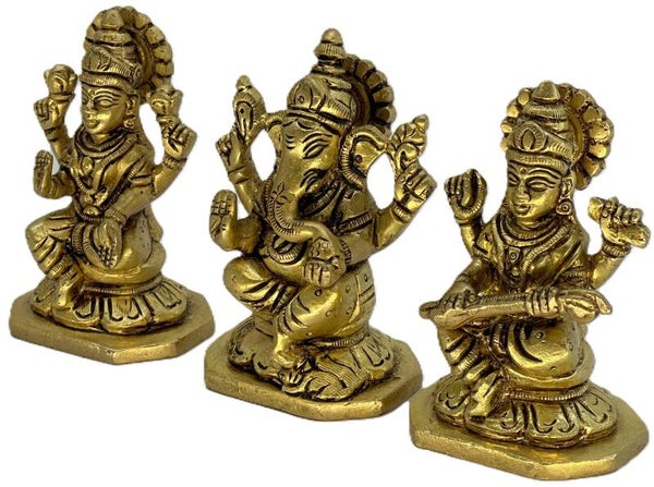 Lakshmi Ganesha Saraswati Statue; Brass Small Laxmi Ganesh Sarasvati Idol Gifts Weight: Sarasvathi: 0.275 kg, Ganesh: 0.335 kg, L 0.266 kg Length: 2.0 in each Width: 1.5 in each Height: 3.2 in each