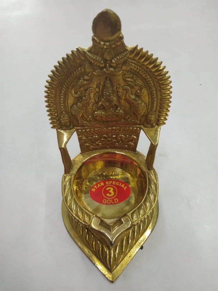 Brass lamp has the statue of Goddess Kamakshi with a deep well in front. The well can be filled with oil and wicks placed for lighting up or diya can be placed.